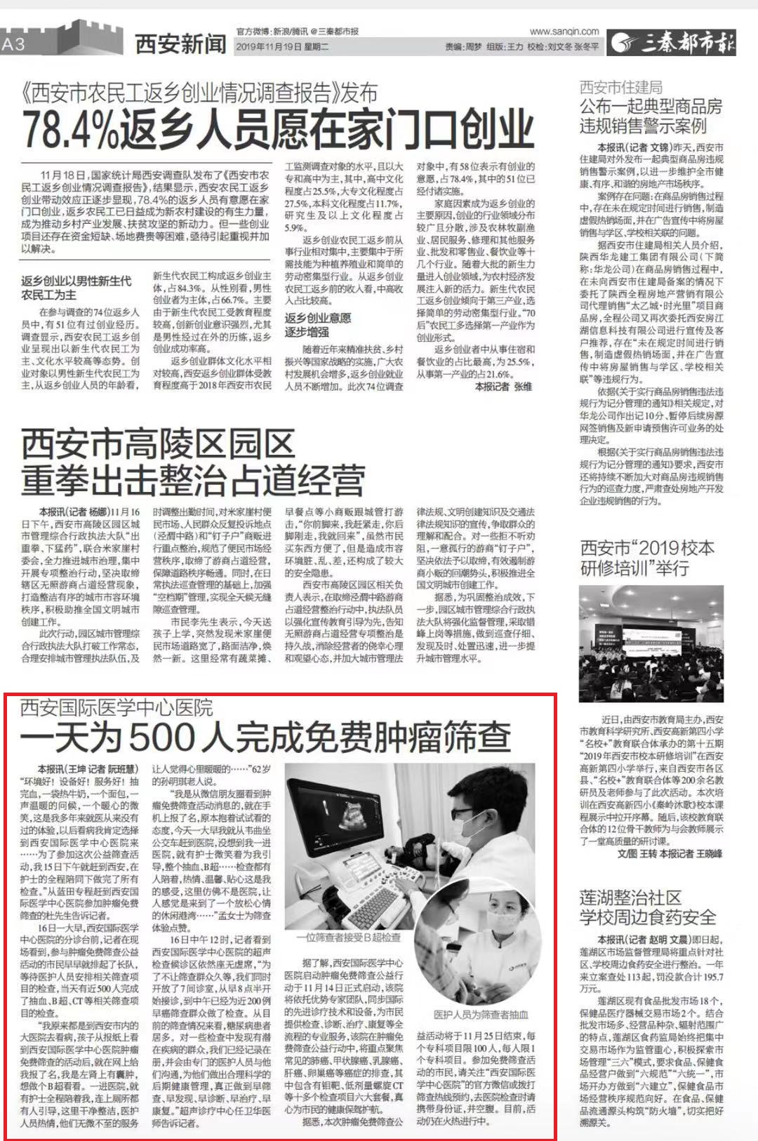 三秦都市報(bào)報(bào)道—西安國際醫(yī)學(xué)中心醫(yī)院一天為500人完成免費(fèi)腫瘤篩查。點(diǎn)擊閱讀。