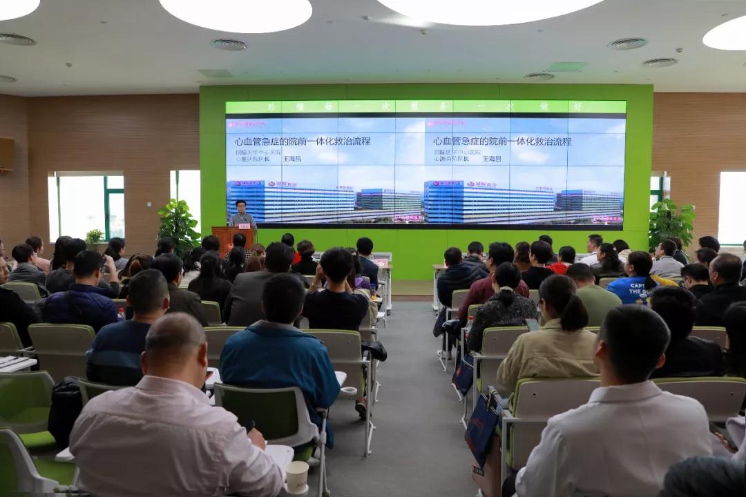 講座環(huán)節(jié),王海昌院長就《心血管急癥的院前院內(nèi)一體化救治》進(jìn)行了詳細(xì)闡述,以大量數(shù)據(jù)強(qiáng)調(diào)了心血管疾病救治過程中把握時(shí)間窗的重要性,建議根據(jù)急性冠脈綜合征突發(fā)性、不可預(yù)測的特點(diǎn),建立完善的院前、院內(nèi)急救網(wǎng)絡(luò)、胸痛中心,協(xié)助120高速有效的運(yùn)轉(zhuǎn);潘僑主任為大家介紹了心梗伴室顫猝死的院前院內(nèi)救治,分析搶救成功的心肌梗死案例,講解了發(fā)生心跳驟停患者中80-95%為心源性,心源性休克首選冠脈介入診療,院前及院內(nèi)急救早期、快速并完全地開通梗死相關(guān)動脈是改善患者預(yù)后的關(guān)鍵。