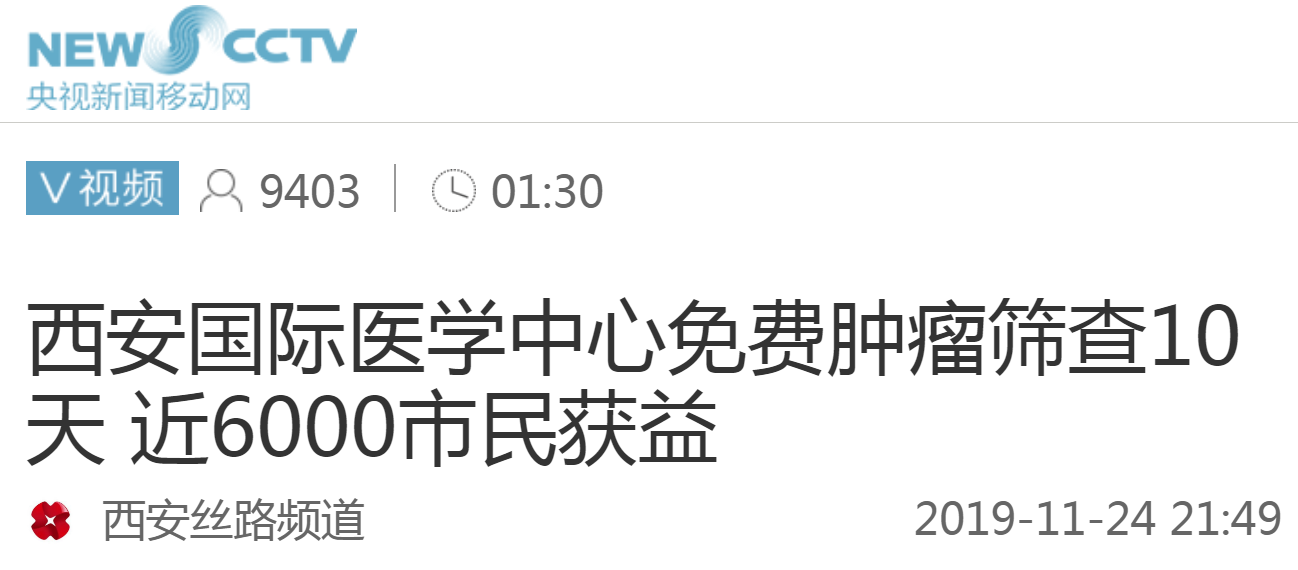 央視新聞移動網(wǎng)報(bào)道—西安國際醫(yī)學(xué)中心免費(fèi)腫瘤篩查10天 近6000市民獲益。點(diǎn)擊閱讀。
