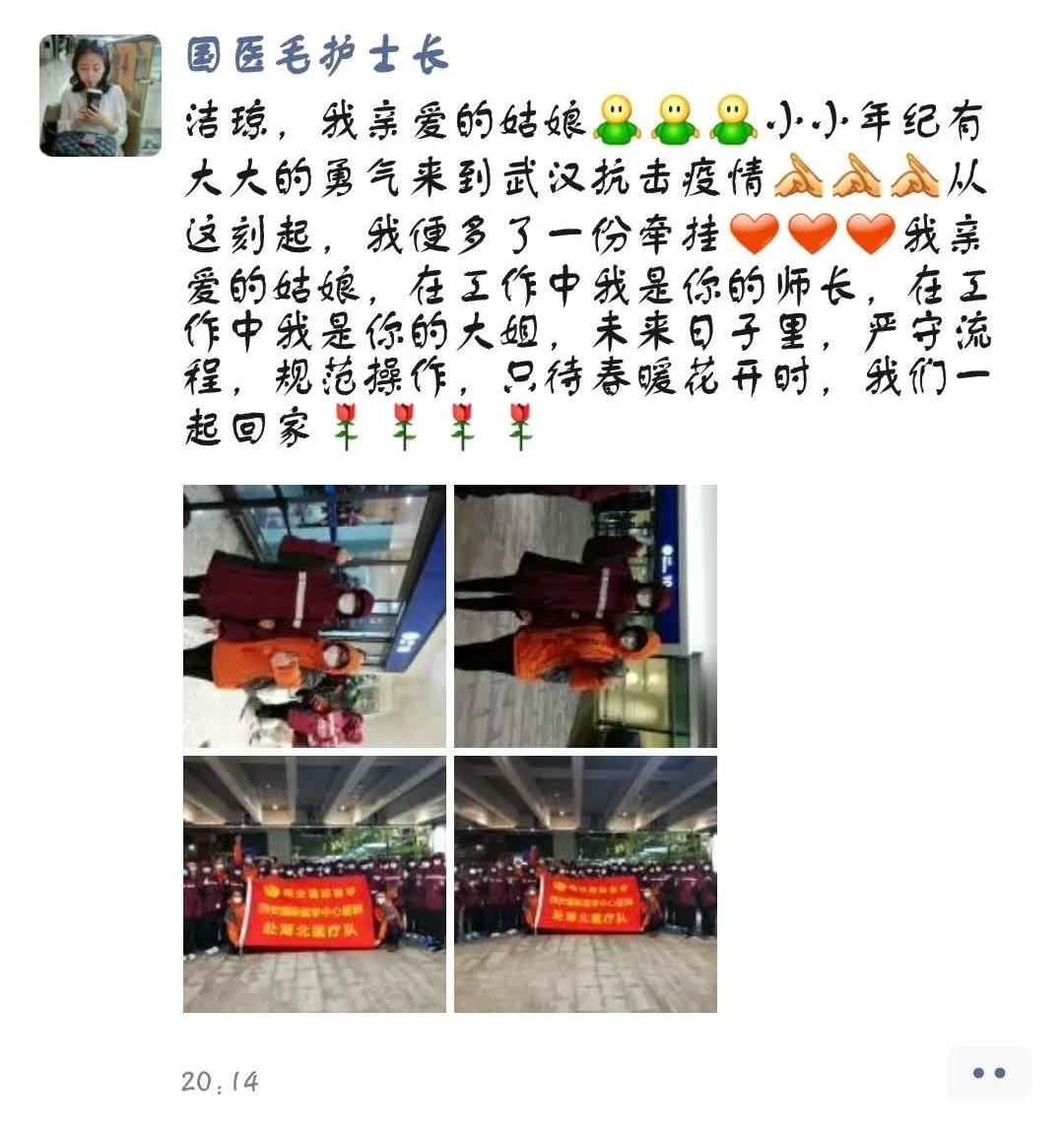 “潔瓊,我親愛的姑娘,小小年紀(jì)有大大的勇氣來到武漢,抗擊疫情,從這刻起,我便多了一份牽掛,我親愛的姑娘,在工作中我是你的師長,在生活中我是你的大姐姐,未來日子里,嚴(yán)守流程,規(guī)范操作,只待春暖花開時,我們一起回家?!边@些話中充滿了護(hù)士長對潔瓊的鼓勵、疼惜、牽掛以及對抗擊疫情必勝的信心,我親愛的戰(zhàn)士們,加油,我們與你同在。