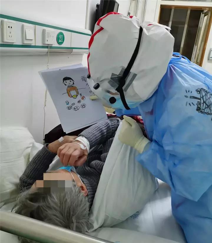 車敏鑫并沒有放棄,依然耐心的用肢體動作比劃著、交流著,大致了解奶奶的意思,并給奶奶找來水杯、臉盆等生活用品。夜間奶奶體溫突然升高到38.3℃,車敏鑫邊比劃著給老奶奶喂水,比劃著叮囑老人發(fā)燒期間要多喝水,和老人一同入院的患者告訴車敏鑫這位奶奶從下午到現(xiàn)在一直沒吃飯,醫(yī)院發(fā)的米飯老太太也咬不動。聽到這車敏鑫立馬聯(lián)系樓上的兩個病區(qū)帶來一份粥和一包豆?jié){。有人問她為何這么耐心地照顧奶奶,她總是溫暖的笑著說:“這個奶奶和我奶奶年紀(jì)差不多大,我是奶奶帶大的孩子,心里就想多幫一幫她?!?/span>