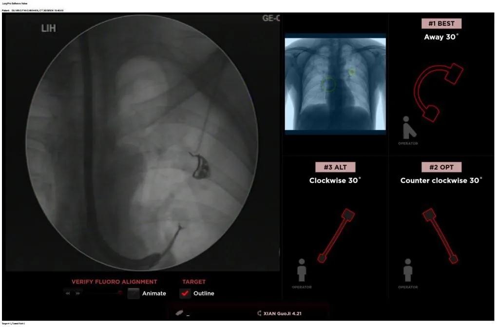 患者是一位59歲的男性,入院診斷左固有上葉前段肺小結(jié)節(jié),大小1.5cm*1.5cm。因為病灶與支氣管不相通,無法開展經(jīng)支氣管自然腔道的活檢,而且病變距離胸壁較遠、肋骨阻隔進針線路、病灶周圍有血管包繞,如果進行CT引導(dǎo)下經(jīng)皮肺穿刺活檢,則存在較大的氣胸、出血等并發(fā)癥的風險。