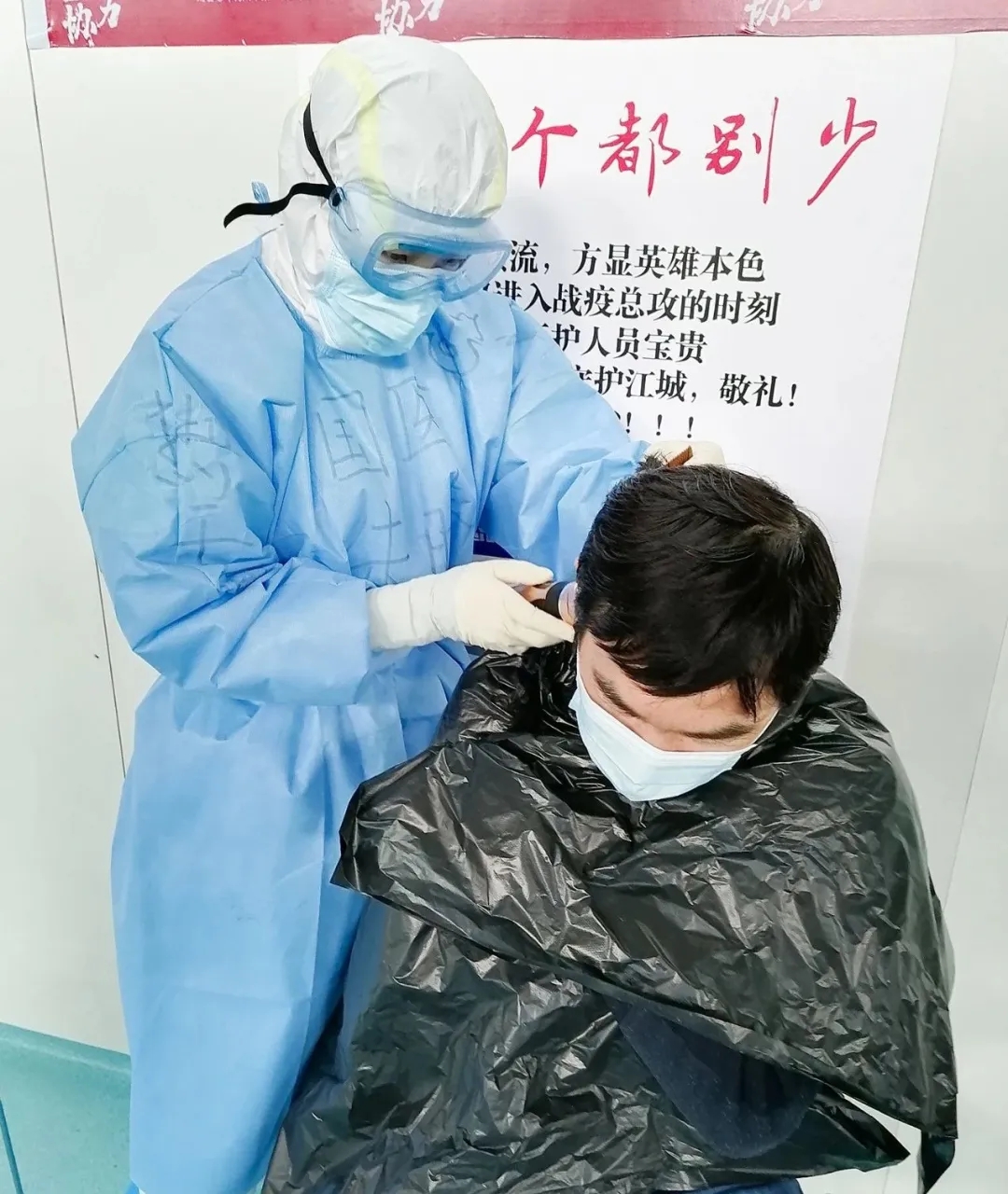 1艙有康復(fù)人員想理發(fā),手頭沒有工具,朱晴護(hù)士長得知后,聯(lián)系下個(gè)班次護(hù)士帶來推子,給大家理發(fā)。“看你動(dòng)作很嫻熟啊,以前練過的吧”,“圍觀群眾”打趣道?!艾F(xiàn)學(xué)現(xiàn)賣,大家要求不要太高,有壓力??!”朱晴說。一直推到推子沒電,朱晴給6位康復(fù)人員簡單修剪了頭發(fā)。得知朱晴是西安醫(yī)療隊(duì)的護(hù)士,大家都親切的稱她“肉夾饃”!