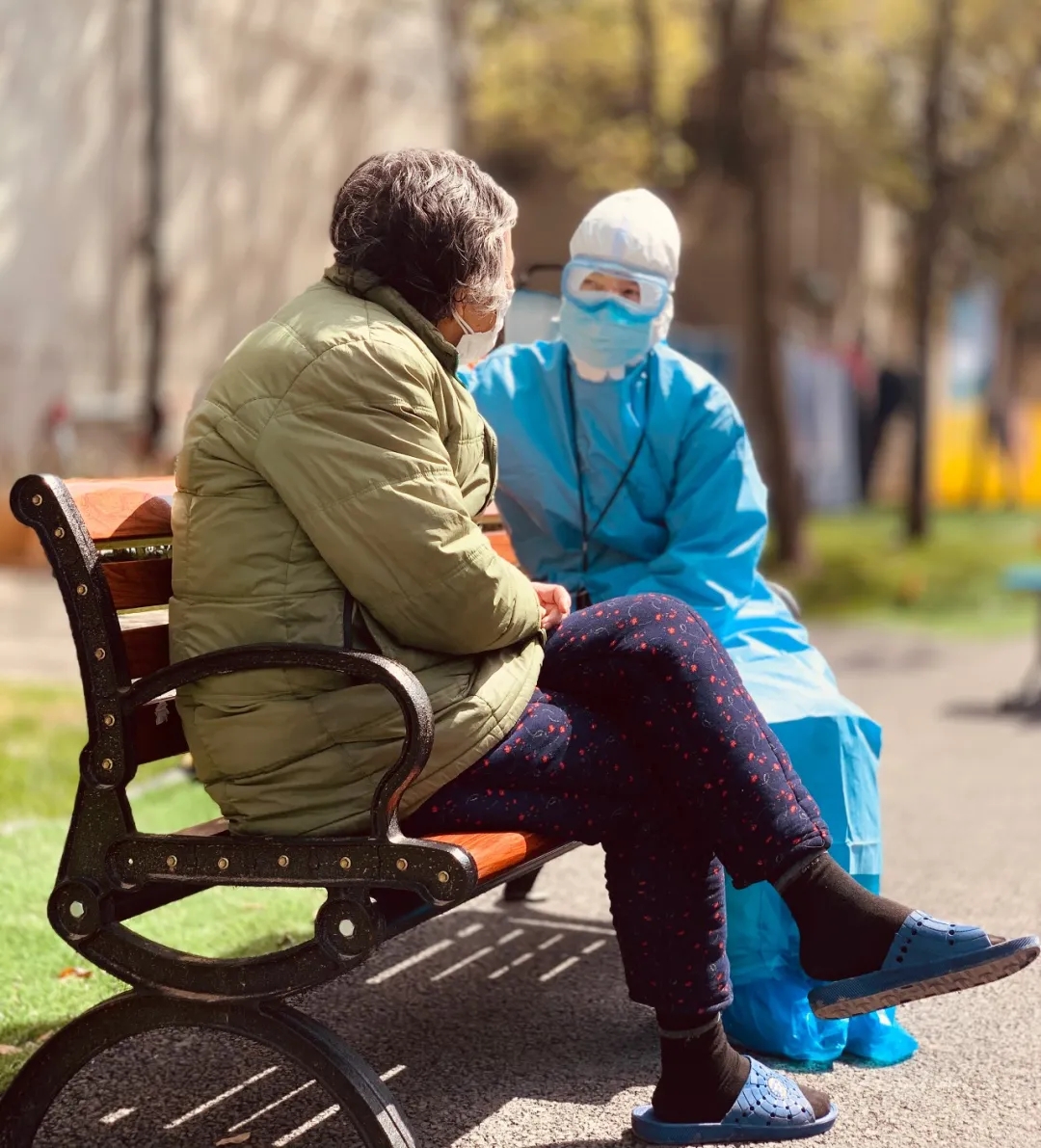 8艙有一位80多歲的老奶奶,中午出來遛彎時(shí)看到了醫(yī)療隊(duì)護(hù)士萬珍妮,主動(dòng)過來攀談?!澳闶顷兾鱽淼??我看你衣服上寫著西安幾個(gè)字了?!薄笆前?,奶奶,我們是西安國際醫(yī)學(xué)中心醫(yī)院來武漢支援的?!比f珍妮通過和奶奶聊天得知,奶奶的父親以前在寶雞工作過很長時(shí)間?!拔乙菜惆雮€(gè)陜西人了。沒想到在這里還能見到“老鄉(xiāng)”!感謝你們!”奶奶感覺很親切,和萬珍妮話起了“家?!?。