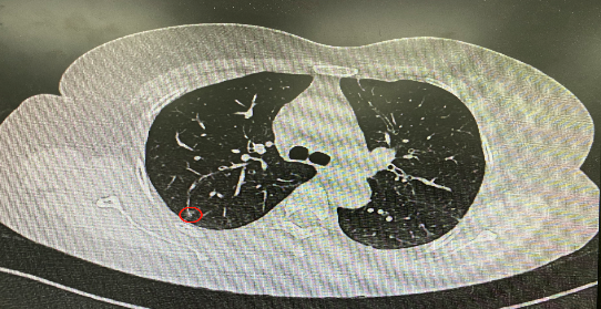 今年54歲的李女士(化名)7月初突然出現(xiàn)右上部腹痛,起初并未在意,以為稍作休息就會好轉(zhuǎn),但疼痛卻并未消退,持續(xù)了一個星期。李女士實在難以忍受,才在家人陪伴下來到西安國際醫(yī)學中心醫(yī)院就診。胸外科二病區(qū)崔凱主任接診患者后,詳細詢問病情并查閱檢查資料,經(jīng)胸部HRCT檢查,結(jié)果提示:右肺上葉后段混合密度結(jié)節(jié)影,考慮原位癌可能,即將患者收入胸腔外科二病區(qū)住院治療。