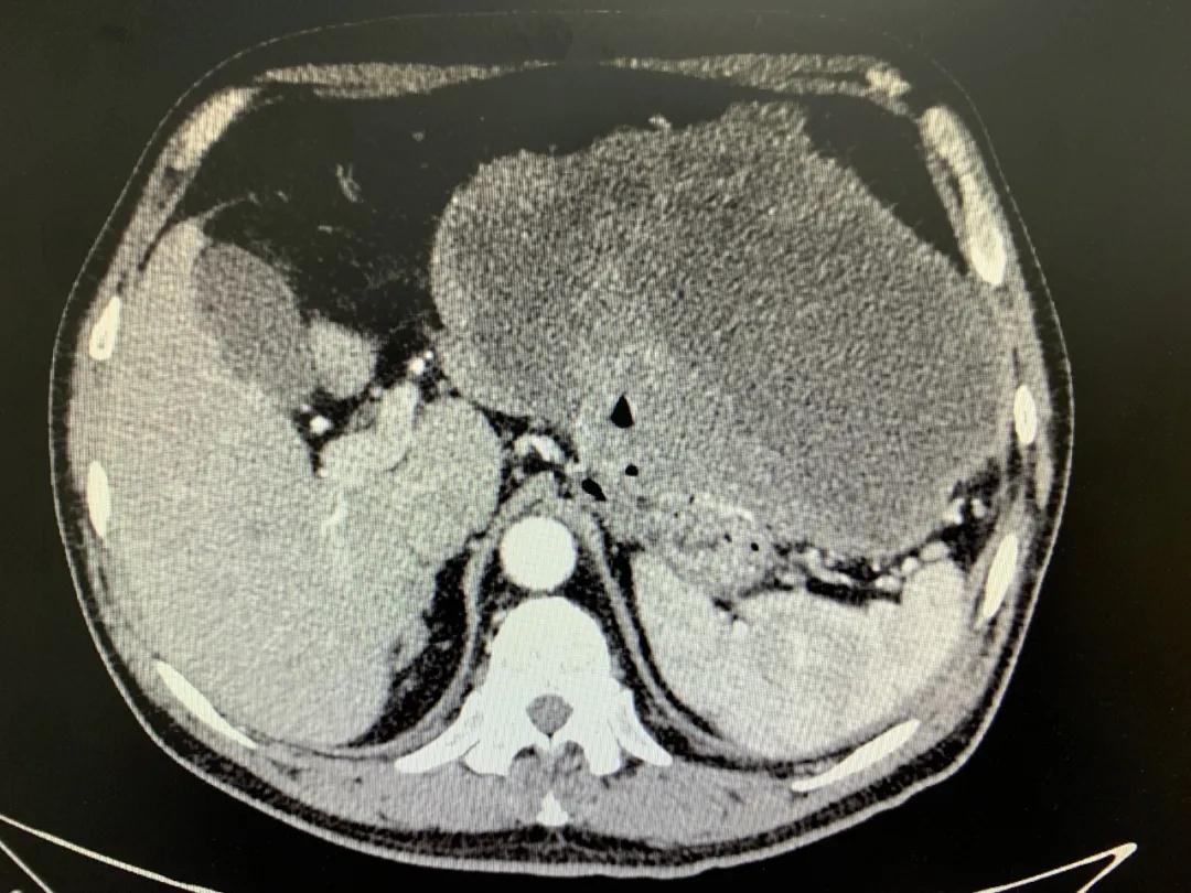 患者入院時血紅蛋白數(shù)值仍持續(xù)下降,出現(xiàn)失血性休克表現(xiàn),危及生命。消化外科二病區(qū)蔡磊主任接診后,組織科室迅速對患者進(jìn)行了全面的檢查。CT提示腫瘤大小約19.3*10.3cm,腫瘤內(nèi)提示大量積血。結(jié)合相關(guān)檢查,考慮為罕見的巨大胃間質(zhì)瘤合并出血。