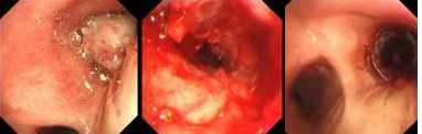 原來,秦爺爺入院時診斷為“右主支氣管”鱗狀細胞癌伴壞死。他的右主支氣管被腫瘤完全堵塞,混合性狹窄。面罩吸氧10升/分的狀況下,指脈氧只有85%,無法平躺,呼吸困難,病情十分危急,隨時有生命危險。