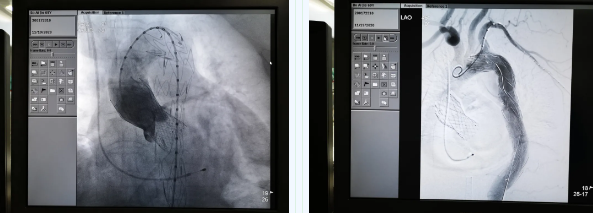 張金洲副院長(zhǎng)關(guān)注著手術(shù)的每一個(gè)細(xì)節(jié),從建立軌道、跨瓣、釋放瓣膜、支架定位、造影和食道超聲確認(rèn),每一步都緊張而有序地進(jìn)行著。為了最大程度保障病人安全,心臟外科程亮副主任也帶隊(duì)建立動(dòng)靜脈入路,以備緊急體外循環(huán)。經(jīng)過(guò)團(tuán)隊(duì)每一位成員的密切配合,在近四小時(shí)的緊張奮戰(zhàn)之后,“TAVR TEVAR”復(fù)合手術(shù)順利完成;經(jīng)過(guò)造影和食道超聲證實(shí):人工主動(dòng)脈瓣無(wú)返流無(wú)瓣周漏、冠脈顯影良好,主動(dòng)脈覆膜支架無(wú)內(nèi)漏無(wú)移位。