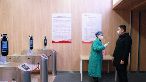 在地鐵閘機(jī)口,西安國(guó)際醫(yī)學(xué)中心醫(yī)院設(shè)立預(yù)檢通道,醫(yī)務(wù)人員為所有進(jìn)入院區(qū)人員測(cè)量體溫,并查驗(yàn)“一碼通”。健康碼為綠碼、體溫<37.3℃且無(wú)流行學(xué)史的方可進(jìn)入,若體溫≥ 37.3℃、有呼吸道癥狀或流行病學(xué)史、健康碼為黃色或紅色的人員由預(yù)檢醫(yī)務(wù)人員登記完成后帶至發(fā)熱門診。