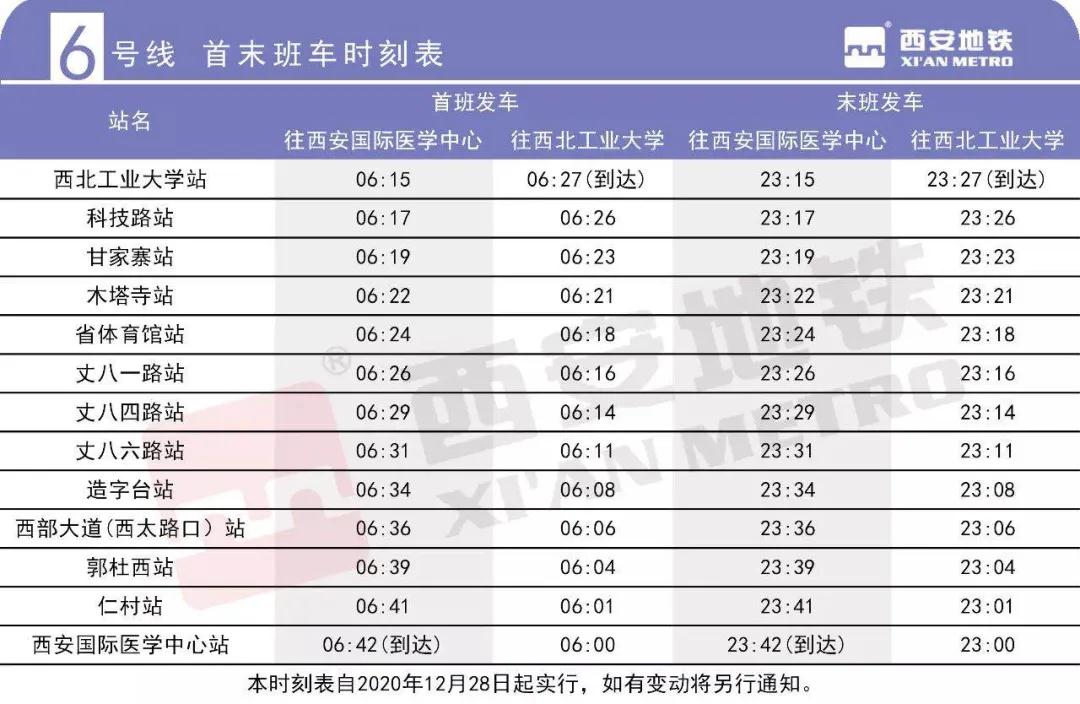 6號線一期開通初期全天開行單一交路,單程行駛時間為27分鐘。6號線一期西安國際醫(yī)學中心首末班車發(fā)車時間分別為6: 00、23: 00, 西北工業(yè)大學首末班車發(fā)車時間分別為6: 15、23: 15,全天運營服務時間17小時43分。線路總體分布情況如圖:
