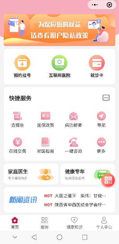 1. 健康專車——距離不是問題!在線下單預(yù)約,健康專車為您提供方便快捷的來院、出院、轉(zhuǎn)院接送預(yù)約服務(wù)。目前該服務(wù)處于試運(yùn)營期間,均可免費(fèi)體驗(yàn)哦。