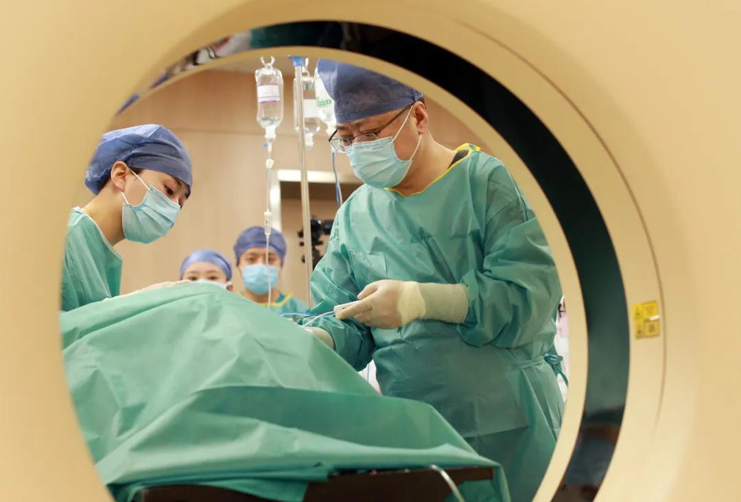 經(jīng)過(guò)放射治療中心陸軍主任的細(xì)致準(zhǔn)備與精準(zhǔn)定位,屈女士的射頻治療開(kāi)始了?;颊卟扇∽髠?cè)臥位,麻醉醫(yī)生立即進(jìn)行靜脈全麻。在CT引導(dǎo)下,醫(yī)生手中的“消融針”,按照既定路線“穿引”,快速、準(zhǔn)確地插入右肺病灶部位,啟動(dòng)射頻機(jī)器進(jìn)行了精準(zhǔn)的消融,右肺局部癌細(xì)胞一下子就被超高溫成功滅活了!經(jīng)CT掃查,無(wú)血?dú)庑兀换颊呱w征平穩(wěn)。2個(gè)小時(shí)后,屈女士就下地活動(dòng)了。