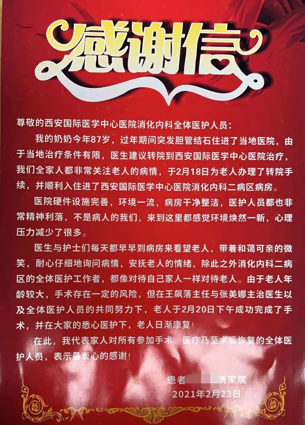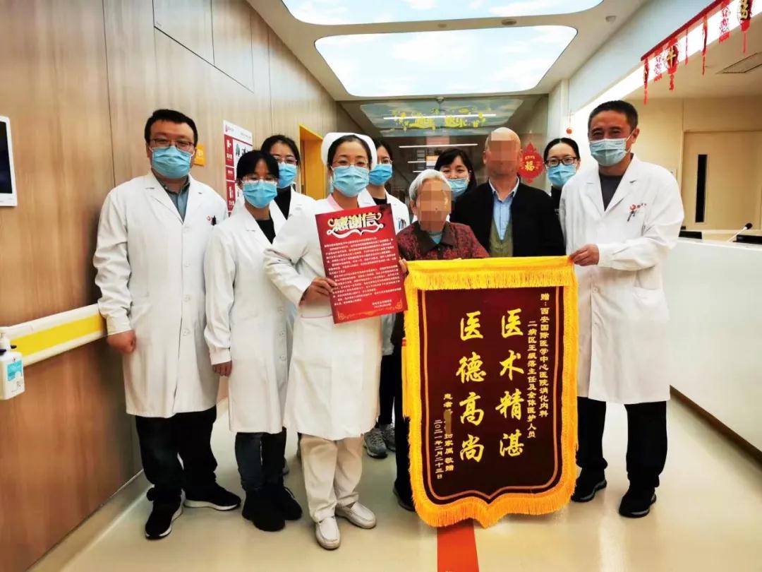 “醫(yī)生與護士們每天都早早到病房看望老人,耐心仔細詢問病情,安撫老人情緒……我代表家人對全體醫(yī)護人員表示最衷心的感謝!”出院當天,岳奶奶的兒女將感謝信與錦旗送到消化內(nèi)科二病區(qū)醫(yī)護人員手中。