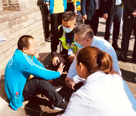 比賽期間,全體參賽人員憑借頑強拼搏的精神和追趕超越的熱情,勇往直前、突破自我,堅持跑完整個賽事全程?;顒舆M行半小時左右,一位阿姨快速向醫(yī)療服務(wù)站走來,尋求幫助?!澳沁呌腥送蝗徊皇娣?,該怎么辦???”阿姨說。