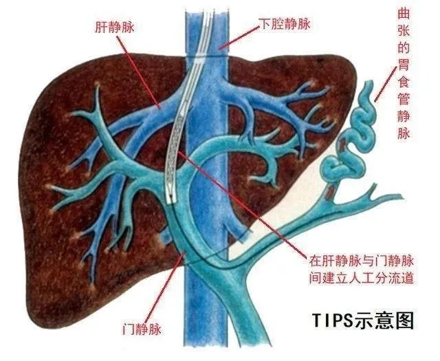 TIPS手術(shù)的出現(xiàn),就是為了解決門靜脈壓力過高引起的一系列并發(fā)癥。手術(shù)原理就是在肝靜脈和門靜脈之間建立一個分流通道,讓壓力很高的門靜脈血,能順利的流出,以達(dá)到降低門靜脈壓力的目的。