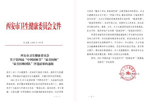在中國醫(yī)師節(jié)到來之際,西安市衛(wèi)健委、高新區(qū)文旅健康局表彰了一批先進醫(yī)療機構(gòu)、優(yōu)秀醫(yī)務(wù)工作者,西安國際醫(yī)學(xué)中心醫(yī)院3個科室、6名醫(yī)生獲得表彰。