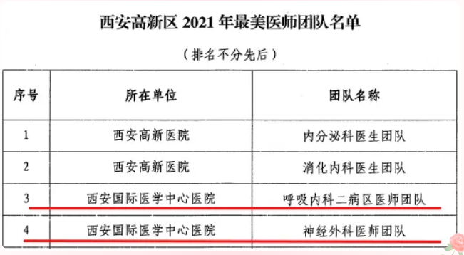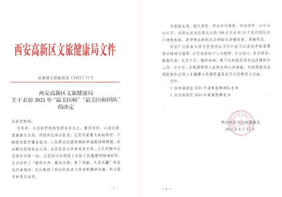 西安高新區(qū)文旅健康局表彰了西安高新區(qū)2021年最美醫(yī)師團隊、最美醫(yī)師。呼吸內(nèi)科二病區(qū)醫(yī)師團隊、神經(jīng)外科醫(yī)師團隊榮獲西安高新區(qū)2021年最美醫(yī)師團隊,董文婷、常亮、楊磊、張安生榮獲西安高新區(qū)2021年最美醫(yī)師。