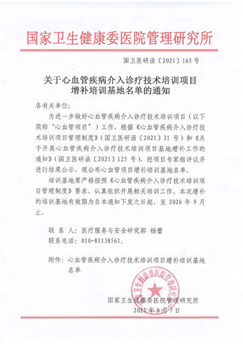 9月7日,在國家衛(wèi)生健康委醫(yī)院管理研究所發(fā)布的《關(guān)于心血管疾病介入診療技術(shù)培訓(xùn)項目增補培訓(xùn)基地名單的通知》中,西安國際醫(yī)學(xué)中心醫(yī)院榜上有名,這標(biāo)志著我院已成功躋身于國家級心血管疾病介入診療醫(yī)療機(jī)構(gòu)行列,同時也標(biāo)志著我院成為陜西省冠心病介入培訓(xùn)基地之一,肩負(fù)心血管介入醫(yī)師的規(guī)范化培訓(xùn)的使命,造福更多的心血管疾病患者。