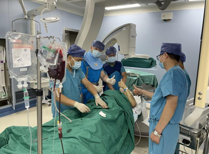 2021年8月16日21:30,消化內(nèi)科五病區(qū)接呼吸科會(huì)診,無誘因反復(fù)黑便10年的黨叔,因嘔血便血發(fā)生失血性休克,希望科室能通過介入手術(shù)快速找到病人出血原因并止血。時(shí)間就是生命,李瑞軍主任毫不猶豫從家趕來,帶著住院總李冰醫(yī)生,把所有能想到的可能引起病人出血的腹腔內(nèi)血管找了個(gè)遍,雖然沒有找到確切誘發(fā)出血的血管,但發(fā)現(xiàn)內(nèi)臟多發(fā)動(dòng)靜脈血管畸形。凌晨5點(diǎn),李主任多次電聯(lián)韓院長,反復(fù)討論患者病情,決定先栓塞部分血管??墒欠祷夭》坎坏揭恍r(shí),病人再發(fā)黑便,血壓掉到70/30mmHg,心率130-160次/分,血氧飽和度測(cè)不出,為預(yù)防窒息,急行氣管插管輔助通氣治療!