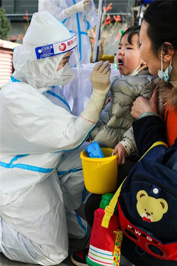 “請您深吸一口氣,屏住呼吸然后迅速摘下口罩,仰頭張大嘴,可能有一點不適,一下就好了。”核酸采樣現(xiàn)場,隊員一遍又一遍地重復(fù)著上述語言,然后迅速用咽拭子為受檢者完成核酸采樣。為了盡快完成采樣工作,隊員們在休息間隙,蹲在地上吃了幾口飯,便迅速投入到工作中。