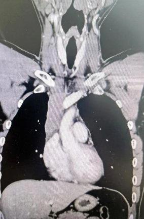 經(jīng)檢查發(fā)現(xiàn)患者前上縱隔腫瘤已經(jīng)完全侵犯了我們?nèi)梭w最主要的大靜脈之一——上腔靜脈,導致上腔靜脈回流嚴重受阻并導致由上腔靜脈起至左側(cè)無名靜脈、右側(cè)鎖骨下靜脈、右側(cè)頸內(nèi)靜脈等多根自上往下回流的靜脈阻塞,從而形成了廣泛的栓子,牢牢堵住了要流回心臟的血流,只能靠別的一些側(cè)支循環(huán)超負荷的工作,這也就是為什么孫先生脖子甚至是頭都明顯腫起來的原因。