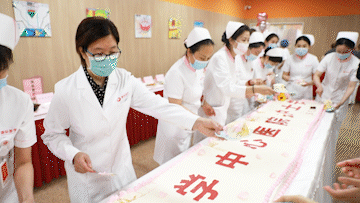 醫(yī)護餐廳為護理兄弟姐妹們精心準備了60*400cm的蛋糕。“祝大家節(jié)日快樂!”李武平副院長、張敏主任及各科室護士長共同切蛋糕送祝福。