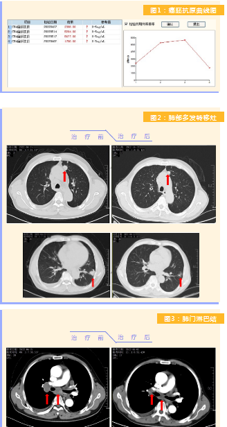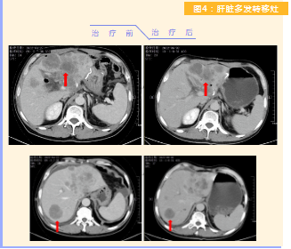 患者完成1周期治療后,上腹部疼痛癥狀基本消失,梗阻性黃疸癥狀緩解,腫瘤指標(biāo)下降(圖1),肺部多發(fā)轉(zhuǎn)移灶消失和縮小(圖2),雙肺門淋巴結(jié)縮小(圖3),肝臟多發(fā)轉(zhuǎn)移灶縮?。▓D4)。