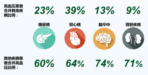 有圖有真相:在高血壓患者中,合并糖尿病的占23%,合并冠心病的占39%,合并腦卒中的占13%,合并腎臟疾病的占9%。而在糖尿病、冠心病、腦卒中、腎臟疾病患者中,合并高血壓的患者分別占了60%、64%、74%和71%。高血壓和上述4個合并癥之間呈現(xiàn)你中有我,我中有你的關(guān)系。