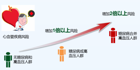 和無糖尿病、高血壓的人群相比,患糖尿病或高血壓能使心血管疾病風(fēng)險增加1倍以上,同時患糖尿病和高血壓的患者,心血管疾病風(fēng)險增加2倍以上。