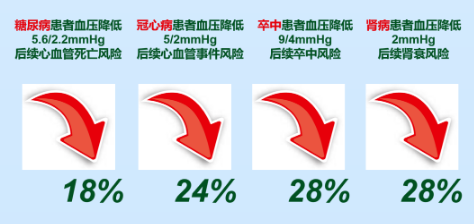 實驗數(shù)據(jù)證實在伴有高血壓合并癥的患者中,血壓輕度降低就能極大地降低相關(guān)心血管風(fēng)險和腎功能衰竭的風(fēng)險。