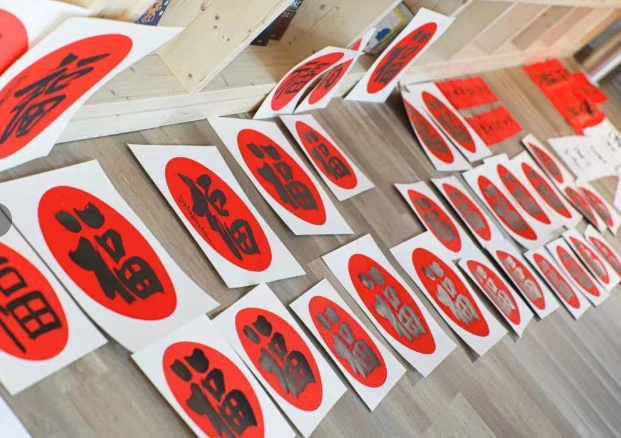 “厚德載物”、“寧靜致遠”、“天高海闊”......一張張燙金的紅紙散發(fā)著墨香,一個個“?!弊衷诳w、行書、草書間自由切換,書法蒼勁有力、磅礴大氣,在紅色的襯托下更顯喜慶祥和。