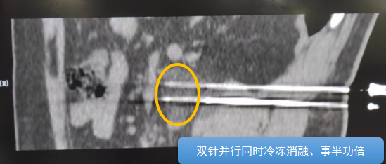 術(shù)中陳寶瑩主任、李鐵柱教授、兀云飛醫(yī)生、魏東紅技師、汝平護士協(xié)調(diào)配合,夾縫進針難度雖大,但在CT引導(dǎo)下逐步進針,精準(zhǔn)到位,順利活檢取得組織,由于腫瘤較大,為了提高消融效率,平行置入兩根冷凍消融針,同時啟動冷凍消融,術(shù)中清晰觀察到冰球完全覆蓋病變,患者沒有任何不舒服,治療中還可以和醫(yī)生聊天。