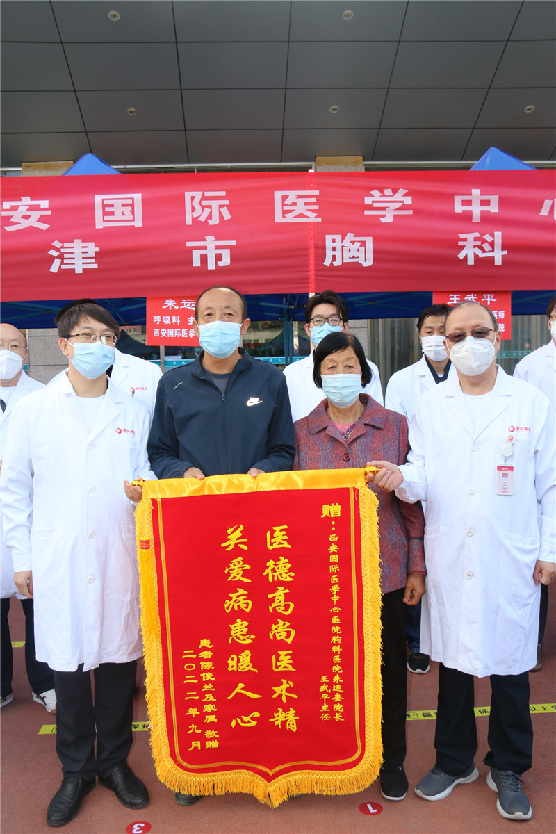 “朱院長(zhǎng)、王主任,出院的時(shí)候我走的匆忙,沒(méi)好好謝謝你們,今天無(wú)論如何都要補(bǔ)上?!崩详愃蜕蟿倓傏s制好的錦旗,連聲道謝。