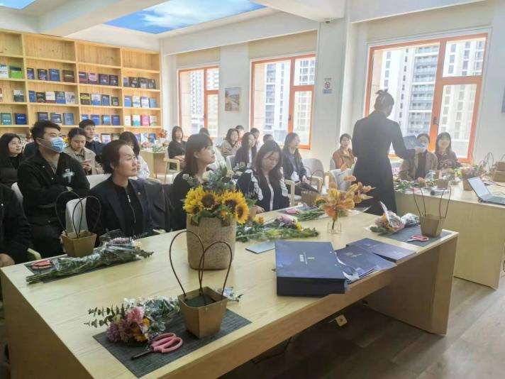活動特邀了專業(yè)的花藝?yán)蠋?,現(xiàn)場為大家進(jìn)行講解和指導(dǎo)。花藝?yán)蠋熢敿?xì)講解了各種花卉所蘊(yùn)含的花語及插花技巧,大家發(fā)揮想象力,用自己靈巧的雙手,將經(jīng)過修剪的向日葵、非洲菊、康乃馨等多種花材,根據(jù)不同的色彩、形狀有層次地搭配在一起,在馥郁花香中感悟取舍之道、領(lǐng)會古雅之美。