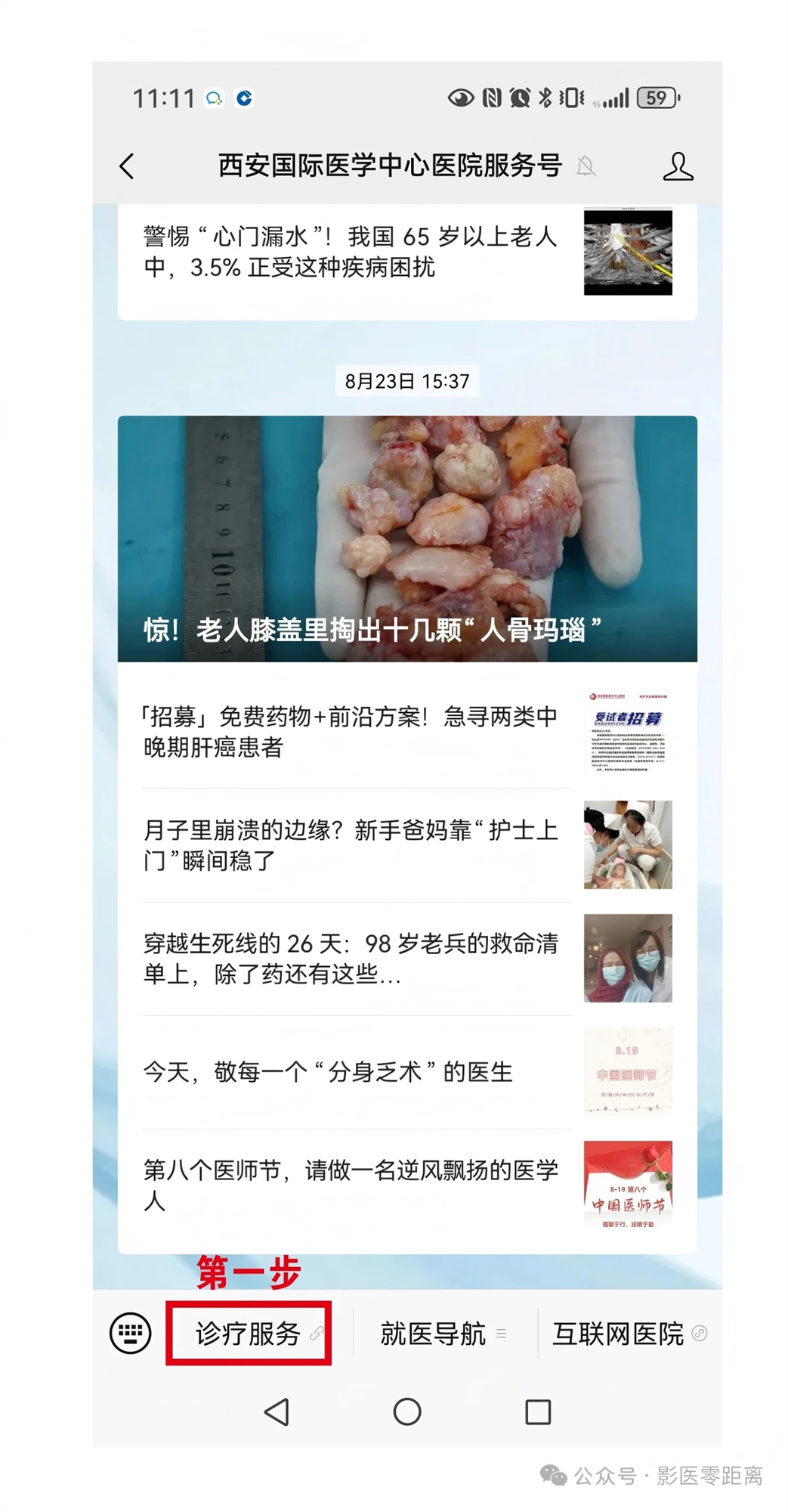 第一步:在醫(yī)院微信公眾號(hào)首頁,點(diǎn)擊底部菜單欄左側(cè)的【診療服務(wù)】入口